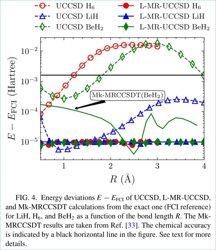 该研究针对当前量子计算在强关联分子体系模拟中资源消耗大、计算精度受限的难题,创新性地引入了粒子数守恒门(PNC) 与线性化BCH展开技术,构建了一种既可高效描述电子强关联、又大幅节省量子资源的多参考态波函数生成与优化框架。该算法在仅使用单双激发算符的情况下,即可在包括解离区在内的整个键长范围内实现化学精度以上的计算准确性,显著优于传统单参考态方法。